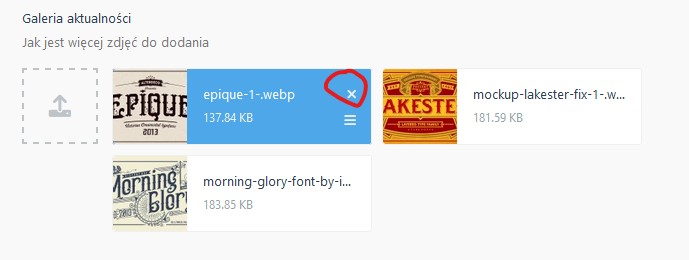 c) Załóżmy że się pomyliliśmy i chcemy dodać inne zdjęcie na okładkę aktualności. Po najechaniu na nazwę pliku pojawi nam się x którym kasujemy zdjęcie.