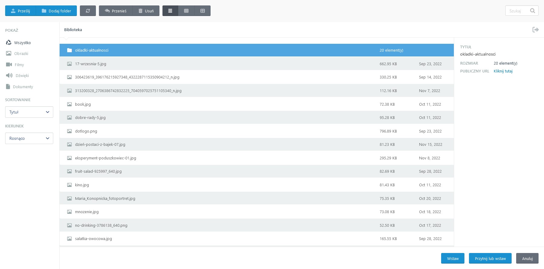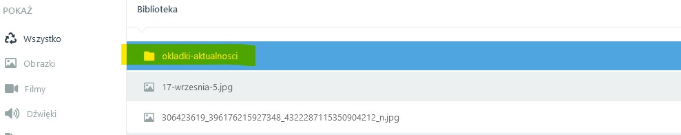 b) Może zdarzyć się sytacja, że chcemy użyć grafiki która została już wcześniej użyta w innej aktualności lub chcemy użyć jednej z "okładek" już wcześniej przygotowanych które "leżą" na dysku strony.