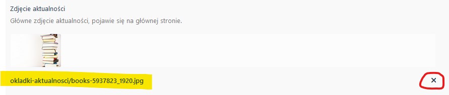 c) Załóżmy że się pomyliliśmy i chcemy dodać inne zdjęcie na okładkę aktualności. Po najechaniu na nazwę pliku pojawi nam się x którym kasujemy zdjęcie.